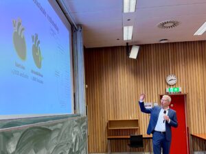 In de sessie ‘Wat levert registreren ons op?’ hield Rik van de Kamp van de Nederlandse Hart Registratie een korte quiz over de patiëntenpopulatie met hartfalen, gebaseerd op gegevens uit de landelijke Hartfalen-registratie en ondersteund door registratiegebaseerd wetenschappelijk onderzoek. Vervolgens bood cardioloog Luc Theunissen inzicht in verschillende innovatieve trajecten van het Nederlands Hart Netwerk, waarin data wordt gebruikt om implementatie, uitkomsten en patiëntervaringen te evalueren. Tot slot liet Hanneke Donkers zien hoe registratie in de eerstelijnszorg steeds belangrijker wordt om inzicht te krijgen in de patiëntpopulatie binnen huisartsenpraktijken. Slides Wat levert registreren ons op?
